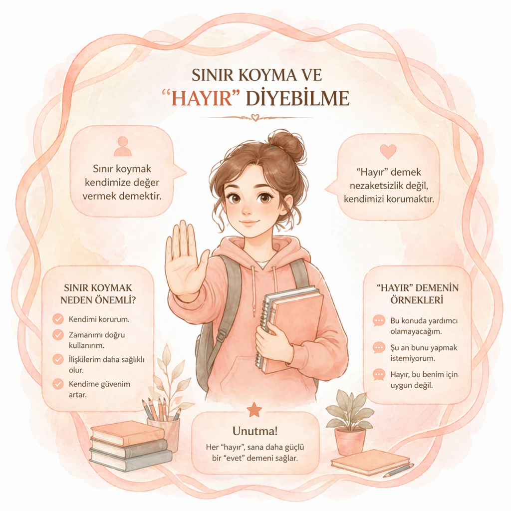 Sağlıklı sınırlar koyabilmek, öğrencilerin hem akademik performanslarını hem de kişisel mutluluklarını korumak için hayati önem taşır. Bu süreçte öğrencilere assertif iletişim teknikleri, “hayır” diyebilme becerileri ve sağlıklı ilişki dinamikleri konusunda profesyonel destek sunulur.